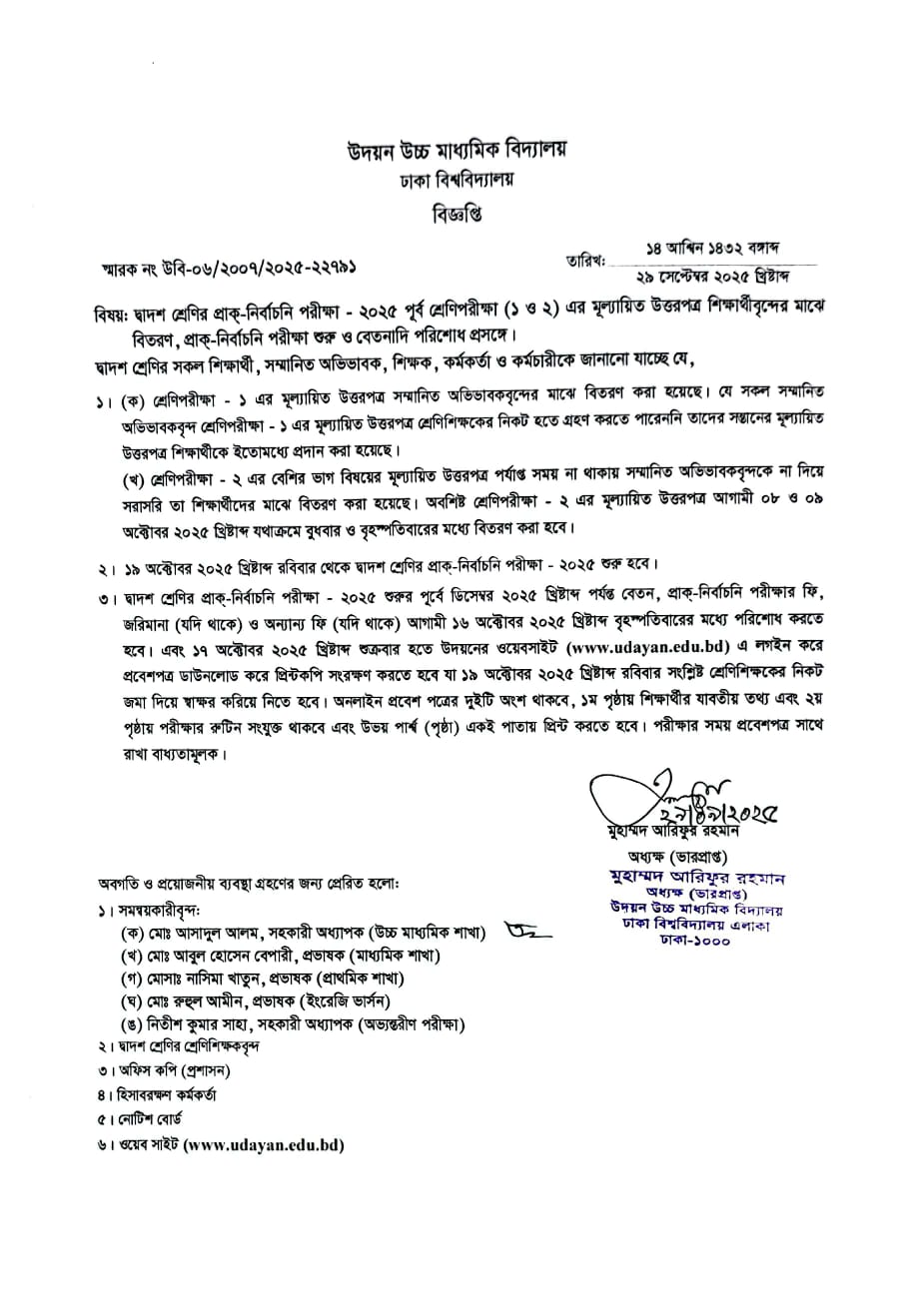 | 2025-08-27 | প্রাক-নির্বাচনি পরীক্ষার প্রস্তুতির জন্য ক্লাস বন্ধ প্রসঙ্গে | ***Leave before Pre-Test*** | Please Click here to Download it. |